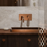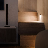 Pesuhuoneessa sama tunturikallion sävyinen kivilaatta jatkuu, luoden yhtenäisen ja ylellisen ilmeen eteisen kanssa. Kylpyhuoneen tunnelma on mykistävä yhdistelmä Lapin luontoa, sen mystisyyttä ja korkeaa laatua. Saunan sisustus on valmistettu arvokkaasta ja äärimmäisen kestävästä keisaripuusta, joka korostaa mökin ainutlaatuisuutta ja hienostunutta tunnelmaa. Vesikalusteet sekä tunnelmallisesti valaistu kiuas ovat tyylikästä kuparia, tuoden tilaan arvokkuutta ja vanhan ajan charmia.